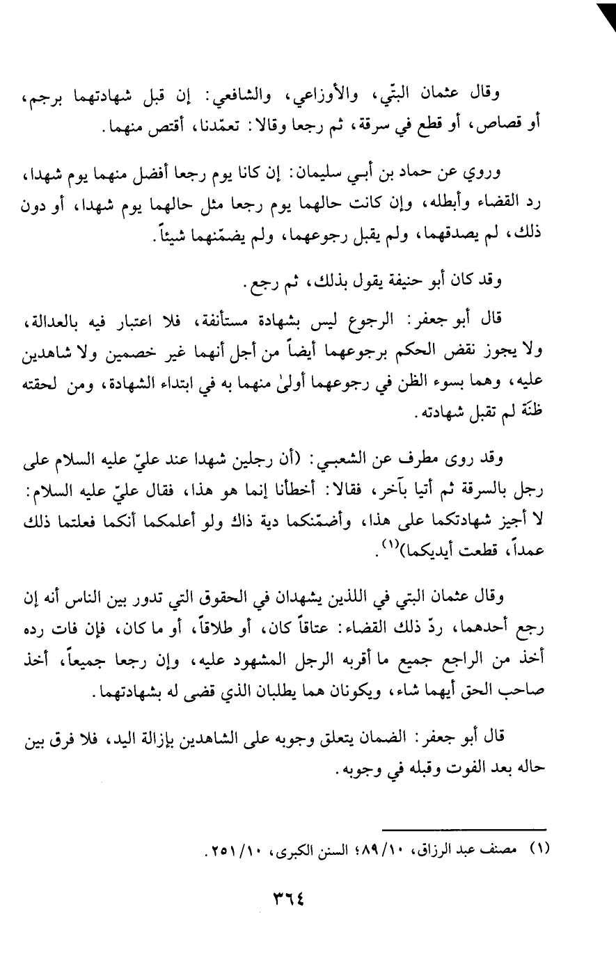 وَقَالَ عُثْمَان البتي فِي اللَّذين يَشْهَدَانِ فِي الْحُقُوق الَّتِي تَدور بَين النَّاس أَنه إِن رَجَعَ أَحدهمَا رد ذَلِك الْقَضَاء عتاقا كَانَ أَو طَلَاقا أوما كَانَ فَإِن فَاتَ رده إخذ من الرَّاجِع جَمِيع مَا أقربه الرجل الْمَشْهُود عَلَيْهِ وَإِن رجعا جَمِيعًا أَخذ صَاحب الْحق أَيهمَا شَاءَ ويكونان هما يطلبان الَّذِي قضى لَهُ بِشَهَادَتِهِمَا
