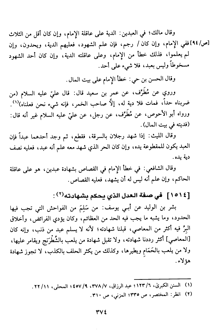 وَقَالَ مَالك فِي الْعَبْدَيْنِ الدِّيَة على عَاقِلَة الإِمَام وَإِن كَانَ أقل من الثَّلَاث فَفِي الإِمَام وَإِن كَانَ رجم فَإِن علم الشُّهُود فَعَلَيْهِم الدِّيَة ويحدون وَإِن لم يعلمُوا فَذَلِك خطأ من الإِمَام وعَلى عَاقِلَته الدِّيَة وَإِن كَانَ أحد الشُّهُود مسخوطا وَلَيْسَ بِعَبْد فَلَا شَيْء على أحد