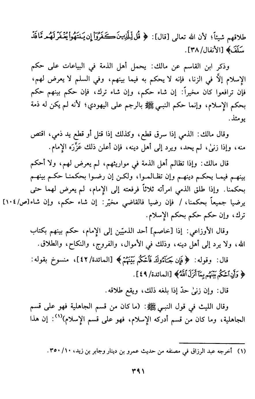 وَذكر ابْن الْقَاسِم عَن مَالك يحمل أهل الذِّمَّة فِي الْبياعَات على حكم الْإِسْلَام إِلَّا فِي الزِّنَا فَإِنَّهُ لَا يحكم بِهِ فِيمَا بَينهم وَفِي السّلم لَا يعرض لَهُم فَإِن ترافعوا كَانَ مُخَيّرا إِن شَاءَ حكم وَإِن شَاءَ ترك فَإِن حكم بَينهم حكم بِحكم الْإِسْلَام وَإِنَّمَا حكم النَّبِي صلى الله عَلَيْهِ وَسلم بِالرَّجمِ على الْيَهُودِيّ لِأَنَّهُ لم يكن لَهُ ذمَّة يَوْمئِذٍ
