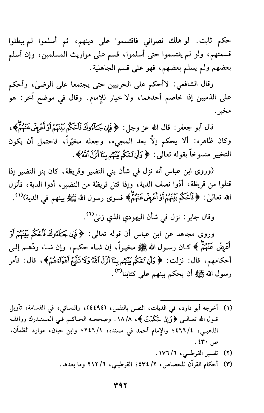 وروى مُجَاهِد عَن ابْن عَبَّاس أَن قَوْله تَعَالَى {فَإِن جاؤوك فاحكم بَينهم أَو أعرض عَنْهُم} كَانَ رَسُول الله صلى الله عَلَيْهِ وَسلم مُخَيّرا إِن شَاءَ حكم وَإِن شَاءَ ردهم إِلَى أحكامهم قَالَ نزلت {وَأَن احكم بَينهم بِمَا أنزل الله وَلَا تتبع أهواءهم} قَالَ فَأمر رَسُول الله صلى الله عَلَيْهِ وَسلم أَن يحكم بَينهم على كتَابنَا
