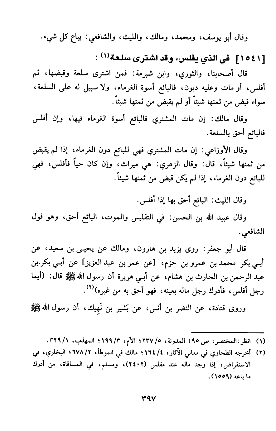قَالَ أَبُو جَعْفَر روى يزِيد بن هَارُون وَمَالك عَن يحيى بن سعيد عَن أبي بكر مُحَمَّد بن عَمْرو بن حزم عَن عمر بن عبد الْعَزِيز عَن أبي بكر بن عبد الرَّحْمَن بن الْحَارِث بن هِشَام عَن أبي هُرَيْرَة أَن رَسُول الله صلى الله عَلَيْهِ وَسلم قَالَ أَيّمَا رجل أفلس فَأدْرك رجل مَاله بِعَيْنِه فَهُوَ أَحَق بِهِ من غَيره