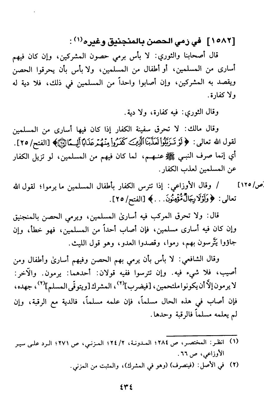 قَالَ أَصْحَابنَا وَالثَّوْري لَا بَأْس برمي حصون الْمُشْركين وَإِن كَانَ فيهم أُسَارَى من الْمُسلمين أَو أَطْفَال من الْمُسلمين وَلَا بَأْس بِأَن يحرقوا الْحصن ويقصد بِهِ الْمُشْركين وَإِن أَصَابُوا وَاحِدًا من الْمُسلمين فِي ذَلِك فَلَا دِيَة لَهُ وَلَا كَفَّارَة