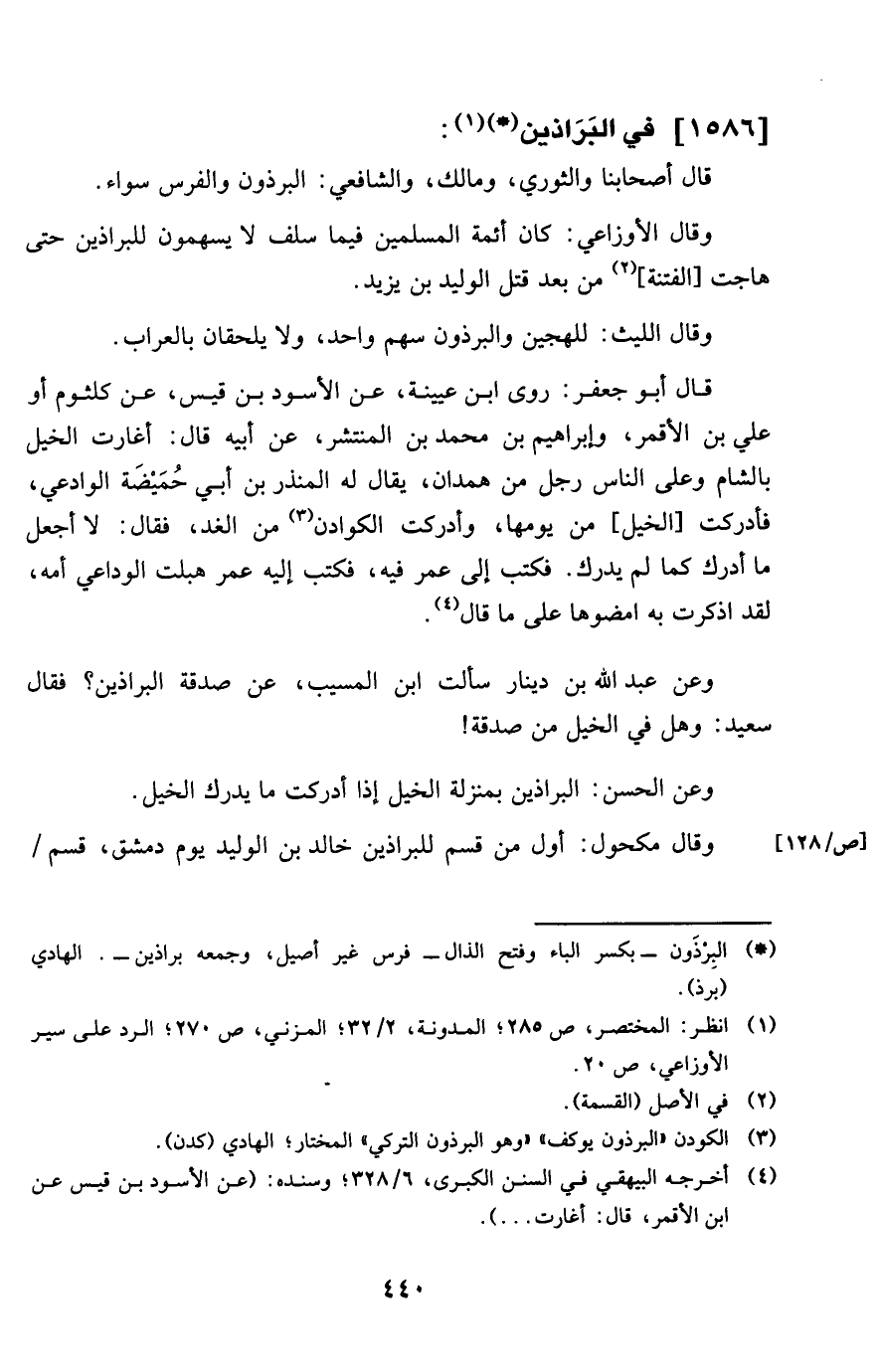 وَقَالَ الْأَوْزَاعِيّ كَانَ أَئِمَّة الْمُسلمين فِيمَا سلف لَا يسهمون للبراذين حَتَّى هَاجَتْ الْفِتْنَة من بعد قتل الْوَلِيد بن يزِيد