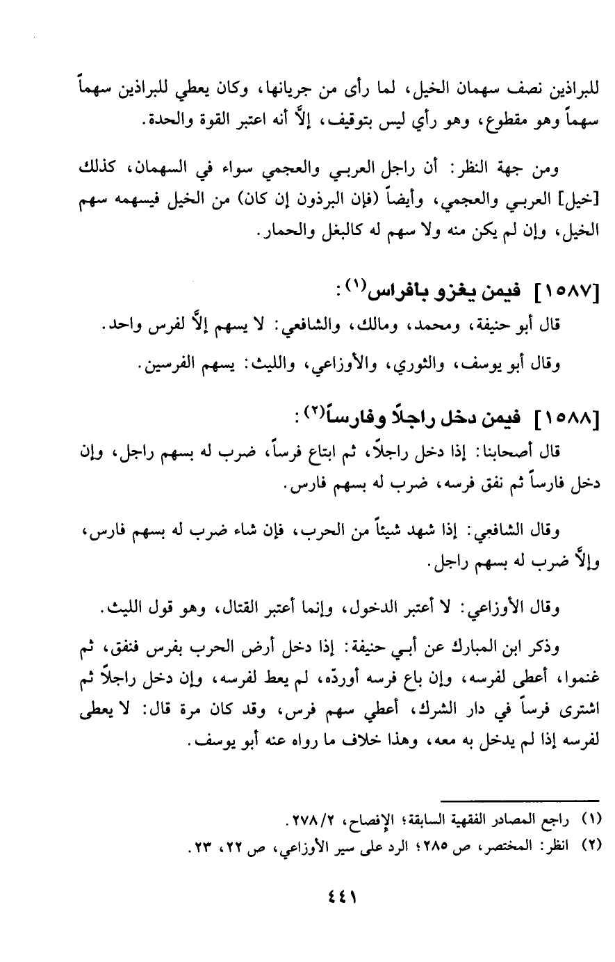 وَمن جِهَة النّظر أَن راجل الْعَرَبِيّ والعجمي سَوَاء فِي السهْمَان كَذَلِك خيل الْعَرَبِيّ والعجمي وَأَيْضًا فَإِن البرذون إِن كَانَ من الْخَيل فيسهمه سهم الْخَيل وَإِن لم يكن مِنْهُ وَلَا سهم لَهُ كالبغل وَالْحمار