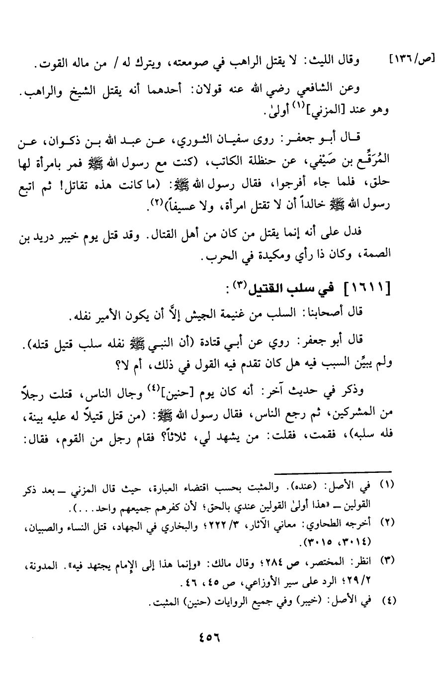 قَالَ أَبُو جَعْفَر روى سُفْيَان الثَّوْريّ عَن عبد الله بن ذكْوَان عَن المرقع بن صَيْفِي عَن حَنْظَلَة الْكَاتِب كنت مَعَ رَسُول الله صلى الله عَلَيْهِ وَسلم فَمر بِامْرَأَة لَهَا حلق فَلَمَّا جَاءَ أفرجوا فَقَالَ رَسُول الله صلى الله عَلَيْهِ وَسلم مَا كَانَت هَذِه تقَاتل ثمَّ اثبع رَسُول الله صلى الله عَلَيْهِ وَسلم خَالِدا أَن لَا تقتل امْرَأَة وَلَا عسيفا
