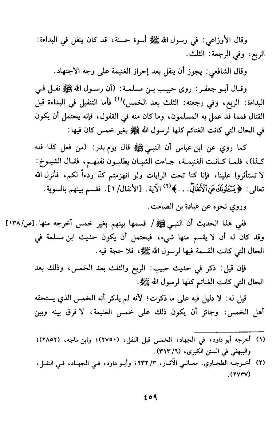 وَقَالَ أَبُو جَعْفَر روى حبيب بن مسلمة أَن رَسُول الله صلى الله عَلَيْهِ وَسلم نفل فِي الْبدَاءَة الرّبع وَفِي رجعته الثُّلُث بعد الْخمس فَأَما التَّنْفِيل فِي الْبدَاءَة قبل الْقِتَال فمما قد عمل بِهِ الْمُسلمُونَ وَمَا كَانَ مِنْهُ فِي القفول فَإِنَّهُ يحْتَمل أَن يكون فِي الْحَال الَّتِي كَانَت الْغَنَائِم كلهَا لرَسُول الله صلى الله عَلَيْهِ وَسلم بِغَيْر خمس كَانَ فِيهَا