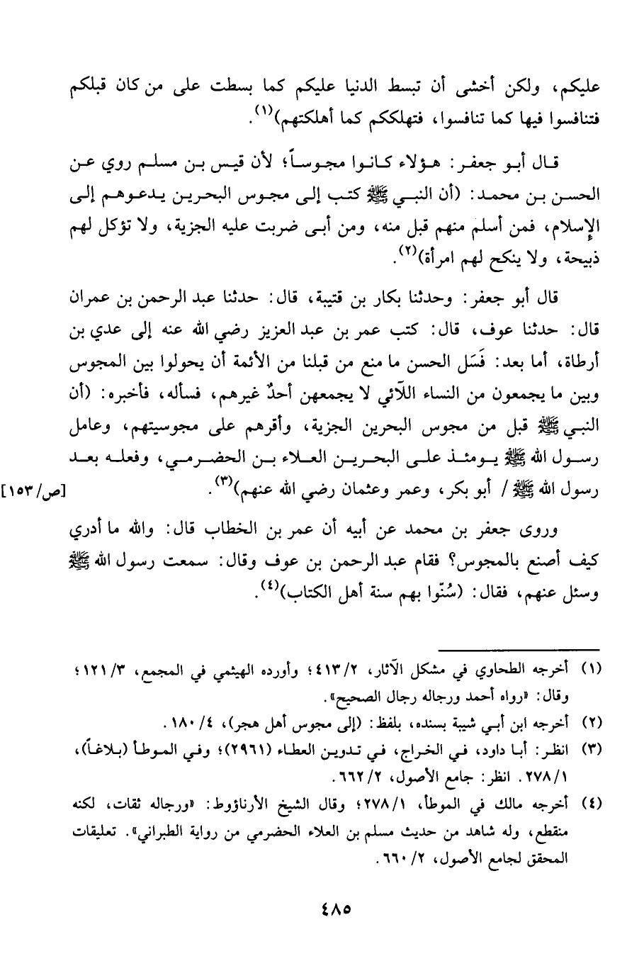 قَالَ أَبُو جَعْفَر وَحدثنَا بكار بن قُتَيْبَة قَالَ حَدثنَا عبد الرَّحْمَن بن عمرَان قَالَ حَدثنَا عَوْف قَالَ كتب عمر بن عبد الْعَزِيز رَضِي الله عَنهُ إِلَى عدي بن أَرْطَاة أما بعد فسل الْحسن مَا منع من قبلنَا من الْأَئِمَّة أَن يحولوا بَين الْمَجُوس وَبَين مَا يجمعُونَ من النِّسَاء اللآئي لَا يجمعهن أحد غَيرهم فَسَأَلَهُ فَأخْبرهُ أَن النَّبِي صلى الله عَلَيْهِ وَسلم قبل من مجوس الْبَحْرين الْجِزْيَة وأقرهم على مجوسيتهم وعامل رَسُول الله صلى الله عَلَيْهِ وَسلم يَوْمئِذٍ على الْبَحْرين الْعَلَاء بن الْحَضْرَمِيّ وَفعله بعد رَسُول الله صلى الله عَلَيْهِ وَسلم أَبُو بكر وَعمر وَعُثْمَان رَضِي الله عَنْهُم