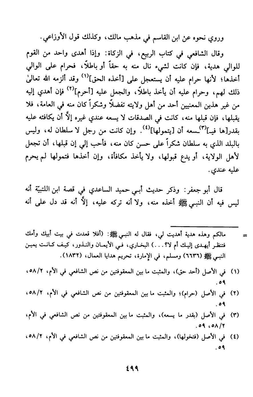 وَقَالَ الشَّافِعِي فِي كتاب الرّبيع فِي الزَّكَاة وَإِذا أهْدى وَاحِد من الْقَوْم للوالي هَدِيَّة فَإِن كَانَت لشَيْء نَالَ مِنْهُ بِهِ حَقًا أَو بَاطِلا فَحَرَام على الْوَالِي أَخذهَا لِأَنَّهَا حرَام عَلَيْهِ أَن يستعجل على أَخذه الْحق وَقد ألزمهُ الله تَعَالَى ذَلِك لَهُم وَحرَام عَلَيْهِ أَن يَأْخُذ بَاطِلا والجعل عَلَيْهِ أحرم فَإِن أهدي إِلَيْهِ من غير هذَيْن الْمَعْنيين أحد من أهل ولَايَته تفضلا وشكرا كَانَ مِنْهُ فِي الْعَامَّة فَلَا يقبلهَا فَإِن قبلهَا مِنْهُ كَانَت فِي الصَّدقَات لَا يَسعهُ عِنْدِي غَيره إِلَّا أَن يُكَافِئهُ عَلَيْهِ بِقَدرِهَا فيسعه أَن يتمولها وَإِن كَانَت من رجل لَا سُلْطَان لَهُ وَلَيْسَ بِالْبَلَدِ الَّذِي بِهِ سُلْطَان شكرا على حسن كَانَ مِنْهُ فَأحب إِلَيّ إِن قبلهَا أَن تجْعَل لأهل الْولَايَة أَو يدع قبُولهَا وَلَا يَأْخُذ مُكَافَأَة وَإِن أَخذهَا فتمولها لم يحرم عَلَيْهِ عِنْدِي