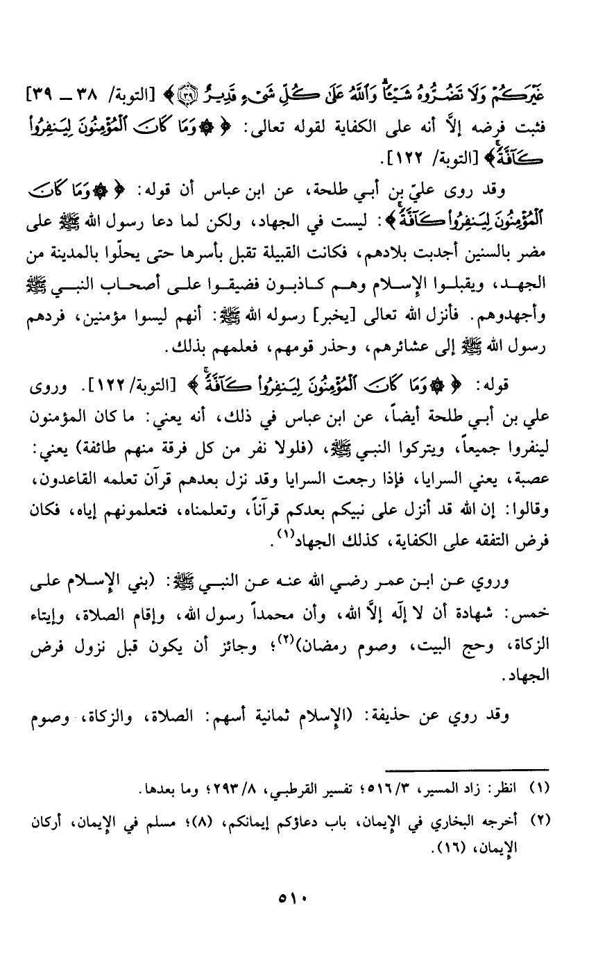قَوْله {وَمَا كَانَ الْمُؤْمِنُونَ لينفروا كَافَّة} وروى عَليّ بن أبي طَلْحَة أَيْضا عَن ابْن عَبَّاس فِي ذَلِك أَنه يَعْنِي مَا كَانَ الْمُؤْمِنُونَ لينفروا جَمِيعًا ويتركوا النَّبِي صلى الله عَلَيْهِ وَسلم فلولا نفر من كل فرقة مِنْهُم طَائِفَة يَعْنِي عصبَة يَعْنِي السَّرَايَا فَإِذا رجعت السَّرَايَا وَقد نزل بعدهمْ قُرْآن تعلمه الْقَاعِدُونَ وَقَالُوا إِن الله قد أنزل على نَبِيكُم بعدكم قُرْآنًا وتعلمناه فتعلمونهم إِيَّاه فَكَانَ فرض التفقه على الْكِفَايَة كَذَلِك الْجِهَاد