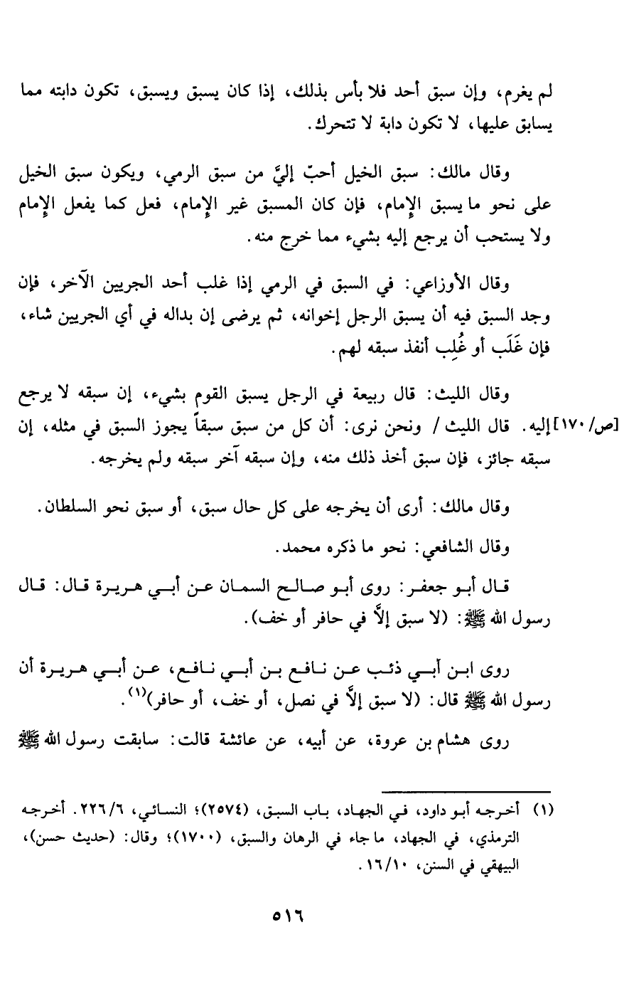 روى ابْن أبي ذِئْب عَن نَافِع بن أبي نَافِع عَن أبي هُرَيْرَة أَن رَسُول الله صلى الله عَلَيْهِ وَسلم قَالَ لَا سبق إِلَّا فِي نصل أَو خف أَو حافر