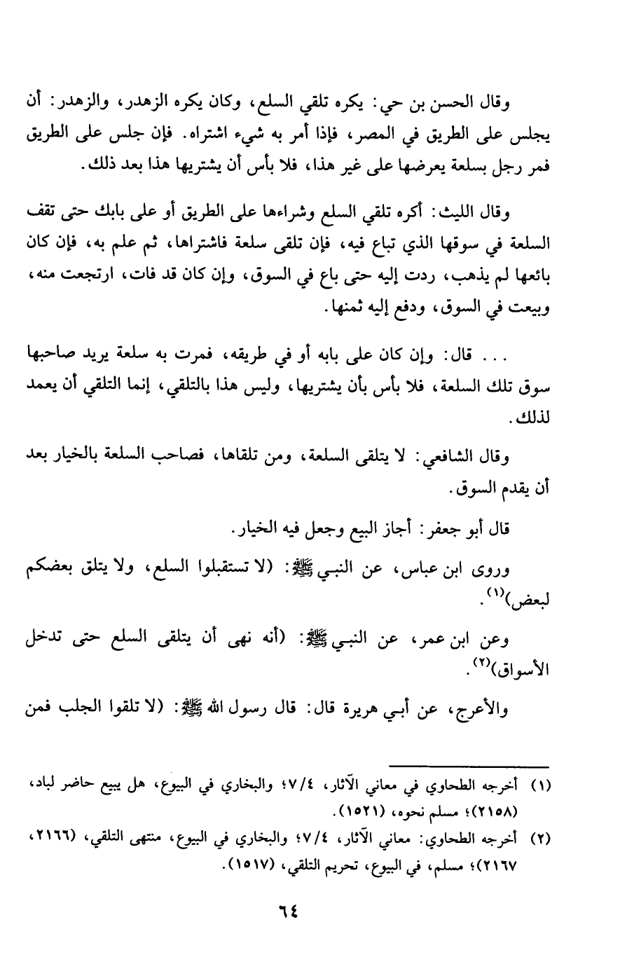 وروى ابْن عَبَّاس عَن النَّبِي صلى الله عَلَيْهِ وَسلم لاتستقبلوا السّلع وَلَا يتلق بَعْضكُم لبَعض