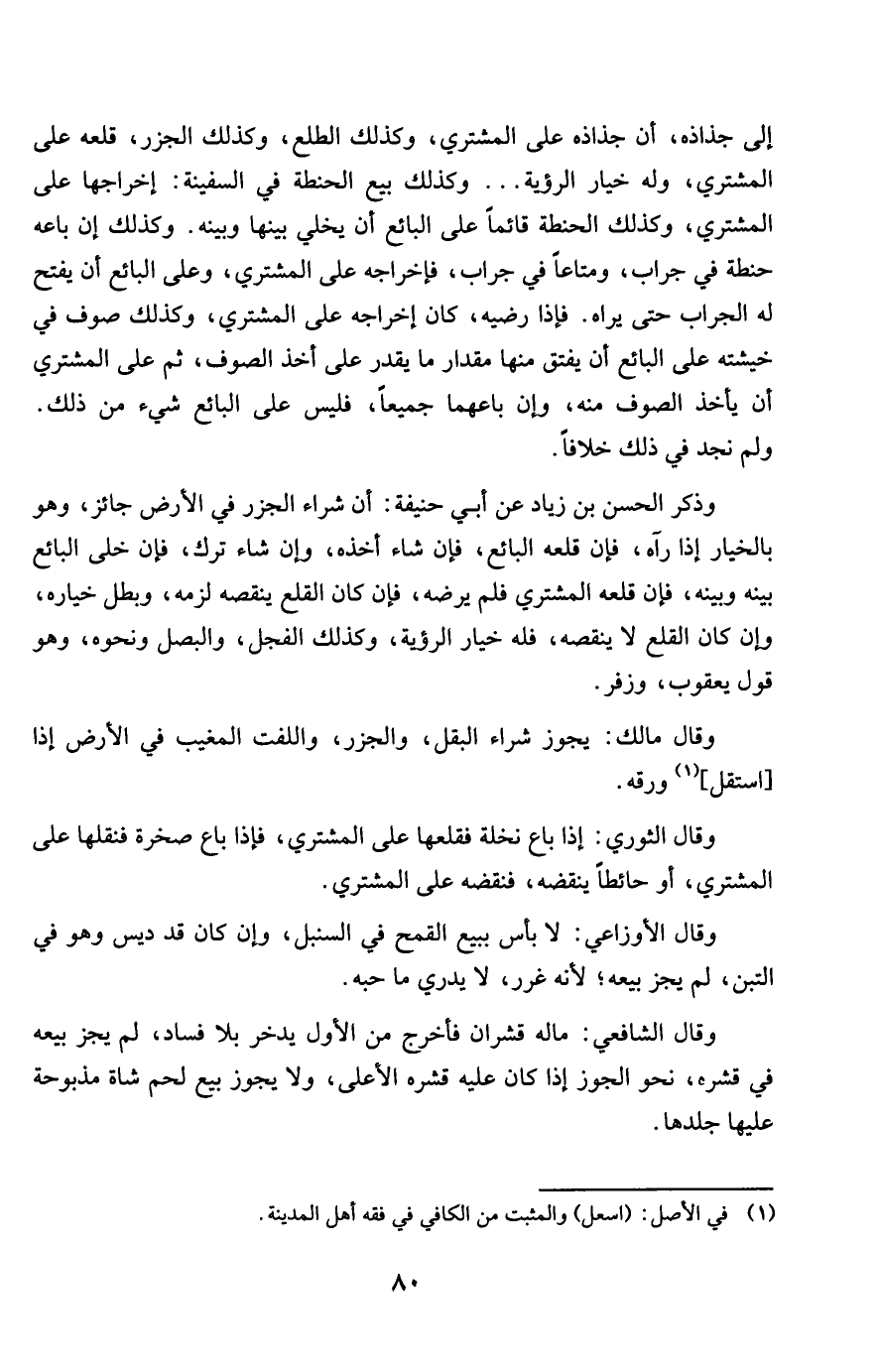 إِلَى جذاذه أَن جذاذه على المُشْتَرِي وَكَذَلِكَ الطّلع وَكَذَلِكَ الجزر قلعه على المُشْتَرِي وَله خِيَار الرُّؤْيَة وَكَذَلِكَ بيع الْحِنْطَة فِي السَّفِينَة إخْرَاجهَا على المُشْتَرِي وَكَذَلِكَ الْحِنْطَة قَائِما على البَائِع أَن يخلي بَينهَا وَبَينه وَكَذَلِكَ إِن بَاعه حِنْطَة فِي حراب ومتاعا فِي جراب فإخراجه على المُشْتَرِي وعَلى البَائِع أَن يفتح لَهُ الجراب حَتَّى يرَاهُ فَإِذا رضيه كَانَ إِخْرَاجه على المُشْتَرِي وَكَذَلِكَ صوف فِي خَشيته على البَائِع أَن يفتق مِنْهَا مِقْدَار مَا يقدر على أَخذ الصُّوف ثمَّ على المُشْتَرِي أَن يَأْخُذ الصُّوف مِنْهُ وَإِن باعهما جَمِيعًا فَلَيْسَ على البَائِع شَيْء من ذَلِك وَلم نجد فِي ذَلِك خلافًا