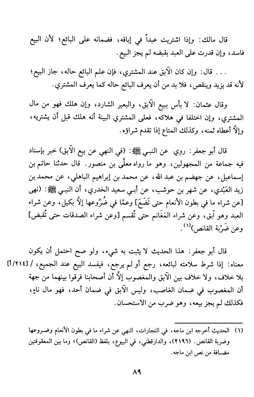 قَالَ أَبُو جَعْفَر رُوِيَ عَن النَّبِي صلى الله عَلَيْهِ وَسلم فِي النَّهْي عَن بيع الْآبِق خبر بِإِسْنَاد فِيهِ جمَاعَة من المجهولين وَهُوَ مَا رَوَاهُ مُعلى بن مَنْصُور قَالَ حَدثنَا حَاتِم بن إِسْمَاعِيل عَن جَهْضَم بن عبد الله عَن مُحَمَّد بن إِبْرَاهِيم الْبَاهِلِيّ عَن مُحَمَّد بن زيد الْعَبْدي عَن شهر بن حَوْشَب عَن أبي سعيد الْخُدْرِيّ أَن النَّبِي صلى الله عَلَيْهِ وَسلم نهى عَن شِرَاء مَا بطُون الْأَنْعَام حَتَّى تضع وَعَما فِي ضروعها إِلَّا بكيل وَعَن تقبض وَعَن ضَرْبَة القانص