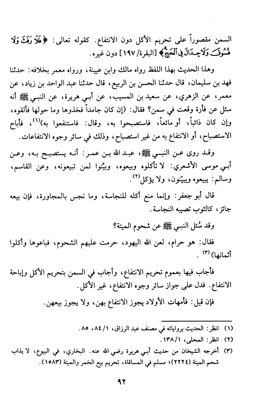 السّمن مَقْصُورا على تَحْرِيم الْأكل دون الِانْتِفَاع كَقَوْلِه تَعَالَى {فَلَا رفث وَلَا فسوق وَلَا جِدَال فِي الْحَج}