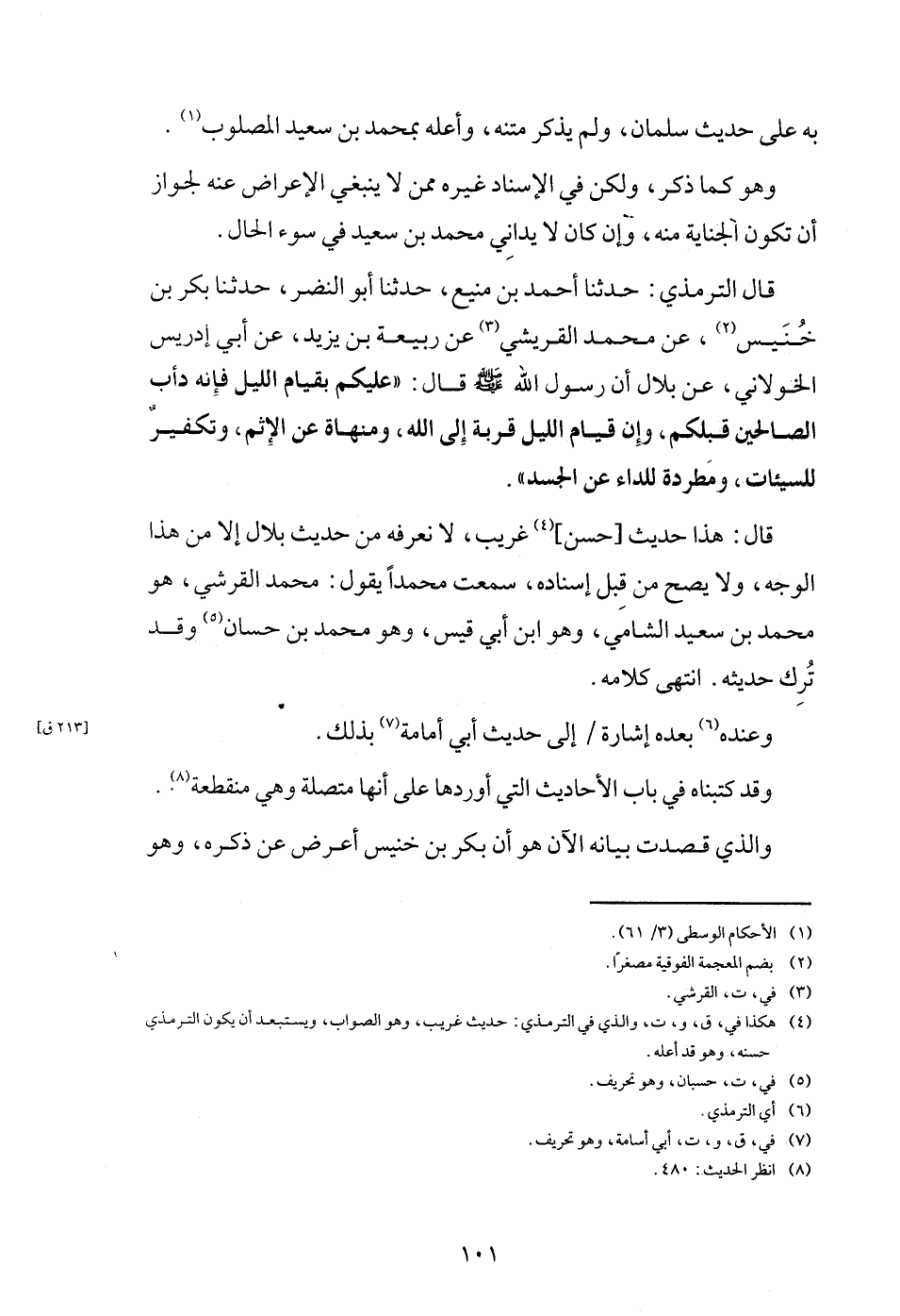 قَالَ التِّرْمِذِيّ: حَدثنَا أَحْمد بن منيع، حَدثنَا أَبُو النَّضر، حَدثنَا بكر بن خُنَيْس، عَن مُحَمَّد القريشي عَن ربيعَة بن يزِيد، عَن أبي إِدْرِيس الْخَولَانِيّ، عَن بِلَال أَن رَسُول الله - صَلَّى اللَّهُ عَلَيْهِ وَسَلَّم َ - قَالَ: " عَلَيْكُم بِقِيَام اللَّيْل فَإِنَّهُ دأب الصَّالِحين قبلكُمْ، وَإِن قيام اللَّيْل قربَة إِلَى الله، ومنهاة عَن الْإِثْم، وتكفير للسيئات، ومطردة للداء عَن الْجَسَد ".