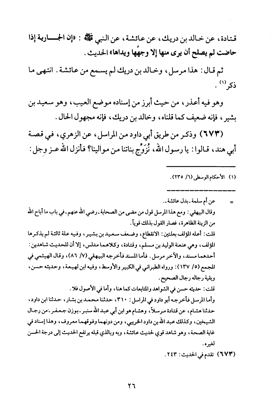 (673) وَذكر من طَرِيق أبي دَاوُد من المراسل، عَن الزُّهْرِيّ، فِي قصَّة أبي هِنْد، قَالُوا: يَا رَسُول الله، نزوج بناتنا من موالينا؟ فَأنْزل الله عز وَجل:
