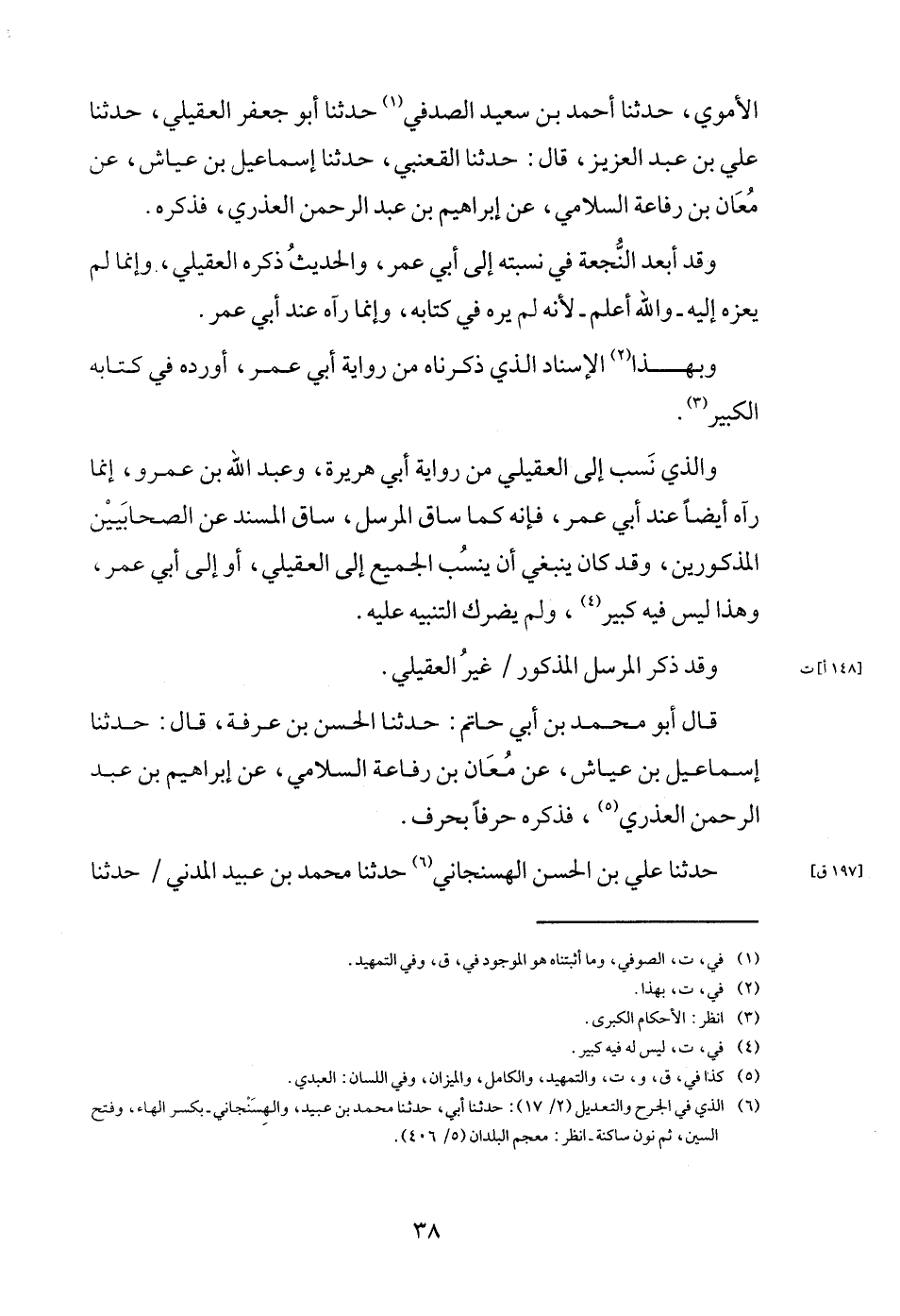 وَالَّذِي نسب إِلَى الْعقيلِيّ من رِوَايَة أبي هُرَيْرَة، وَعبد الله بن عَمْرو، إِنَّمَا رَآهُ أَيْضا عِنْد أبي عمر، فَإِنَّهُ كَمَا سَاق الْمُرْسل، سَاق الْمسند عَن الصحابيين الْمَذْكُورين، وَقد كَانَ يَنْبَغِي أَن ينْسب الْجَمِيع إِلَى الْعقيلِيّ، أَو إِلَى أبي عمر، وَهَذَا لَيْسَ فِيهِ كَبِير، وَلم يَضرك التَّنْبِيه عَلَيْهِ.