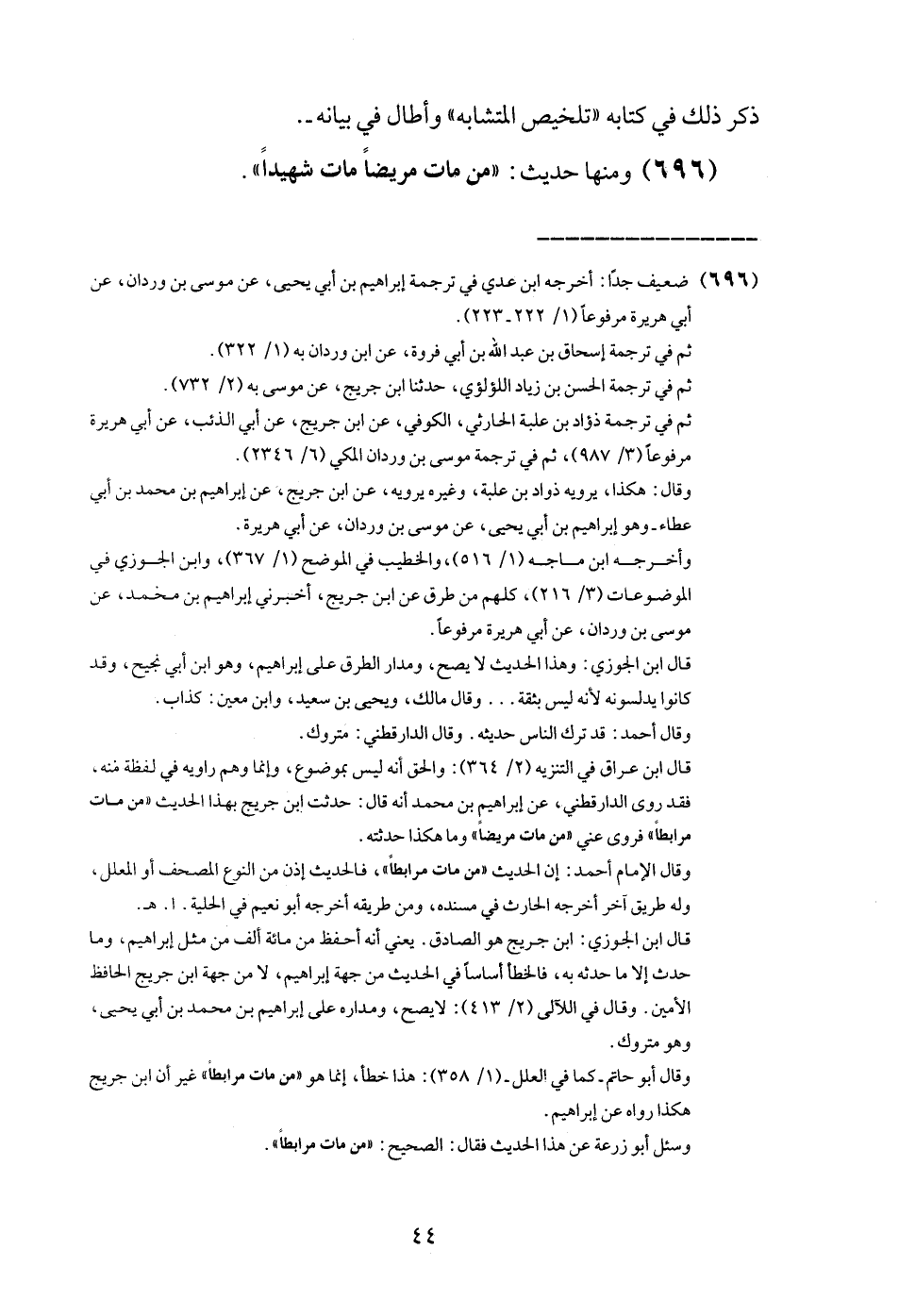 (696) وَمِنْهَا حَدِيث: " من مَاتَ مَرِيضا مَاتَ شَهِيدا ".