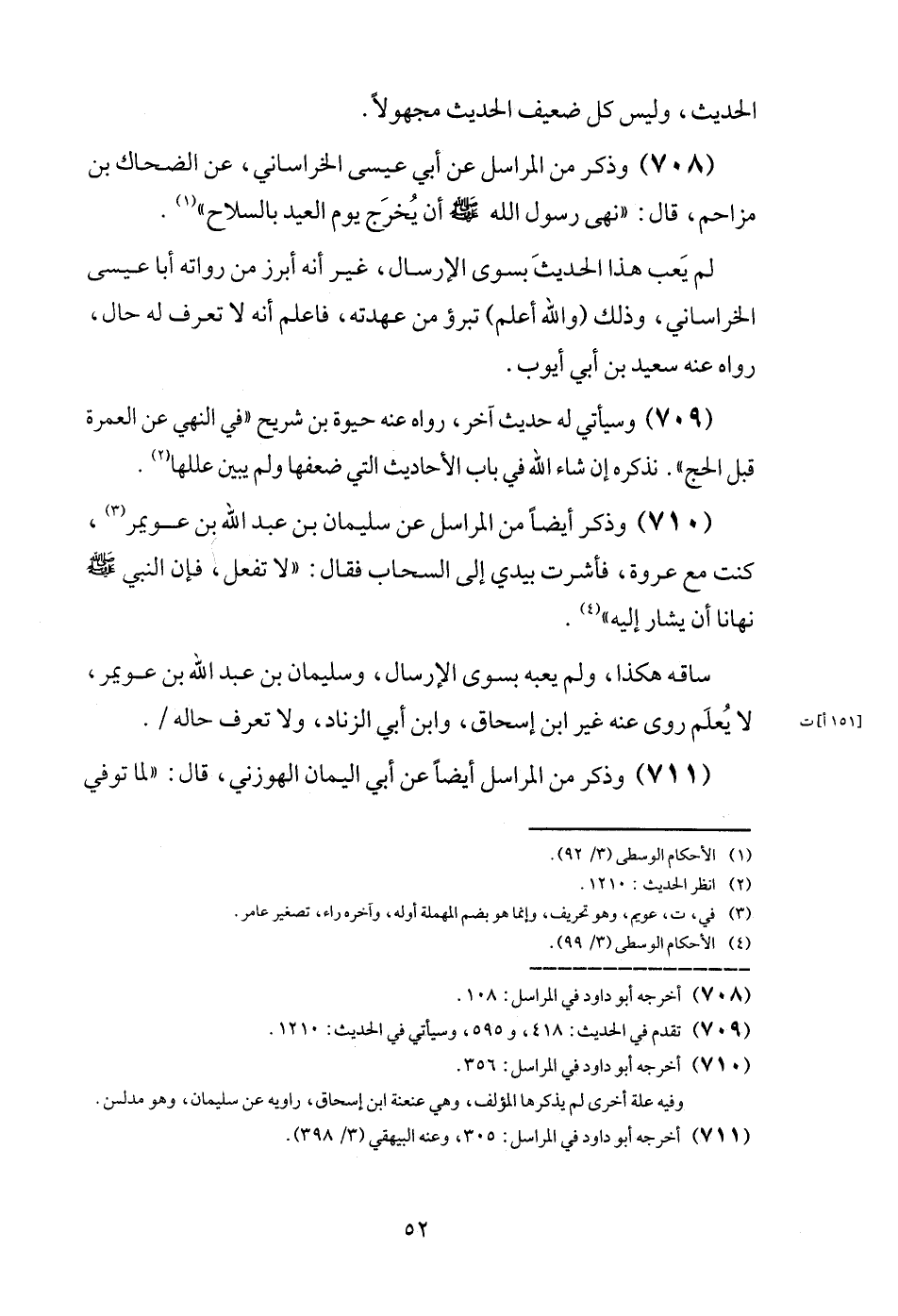 (710) وَذكر أَيْضا من المراسل عَن سُلَيْمَان بن عبد الله بن عُوَيْمِر، كنت مَعَ عُرْوَة، فأشرت بيَدي إِلَى السَّحَاب فَقَالَ: " لَا تفعل، فَإِن النَّبِي - صَلَّى اللَّهُ عَلَيْهِ وَسَلَّم َ - نَهَانَا أَن يشار إِلَيْهِ ".