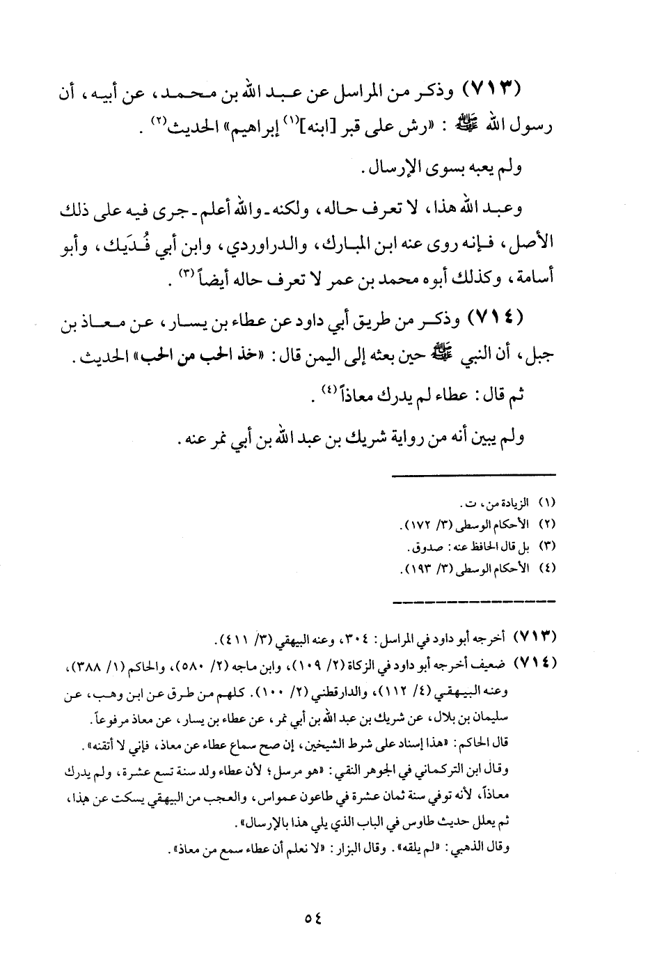 (713) وَذكر من المراسل عَن عبد الله بن مُحَمَّد، عَن أَبِيه، أَن رَسُول الله - صَلَّى اللَّهُ عَلَيْهِ وَسَلَّم َ -: " رش على قبر [ابْنه] إِبْرَاهِيم " الحَدِيث.