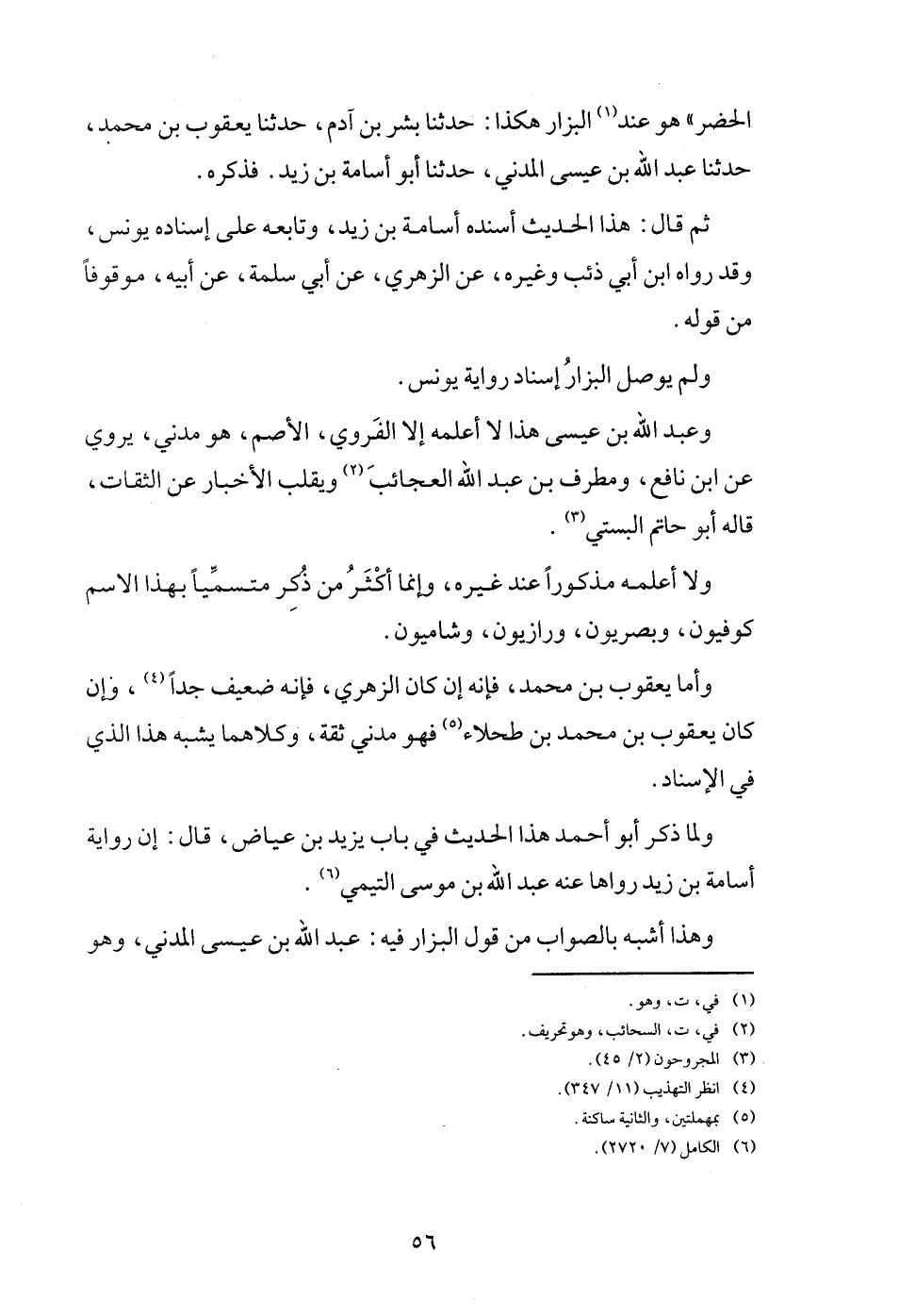 الْحَضَر " هُوَ عِنْد الْبَزَّار هَكَذَا: حَدثنَا بشر بن آدم، حَدثنَا يَعْقُوب بن مُحَمَّد، حَدثنَا عبد الله بن عِيسَى الْمدنِي، حَدثنَا أَبُو أُسَامَة بن زيد. فَذكره.