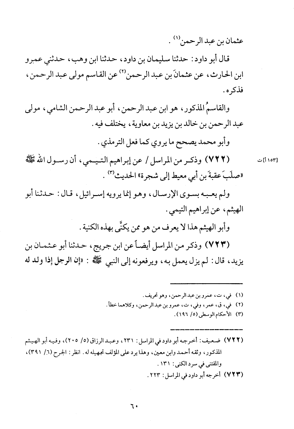 (723) وَذكر من المراسل أَيْضا عَن ابْن جريج، حَدثنَا أَبُو عُثْمَان بن يزِيد، قَالَ: لم يزل يعْمل بِهِ، ويرفعونه إِلَى النَّبِي - صَلَّى اللَّهُ عَلَيْهِ وَسَلَّم َ -: " إِن الرجل إِذا ولد لَهُ