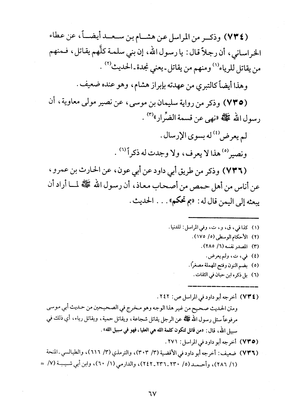 (734) وَذكر من المراسل عَن هِشَام بن سعد أَيْضا، عَن عَطاء الْخُرَاسَانِي، أَن رجلا قَالَ: يَا رَسُول الله، إِن بني سَلمَة كلهم يُقَاتل، فَمنهمْ من يُقَاتل للرياء وَمِنْهُم من يُقَاتل - يَعْنِي نجدة - الحَدِيث.