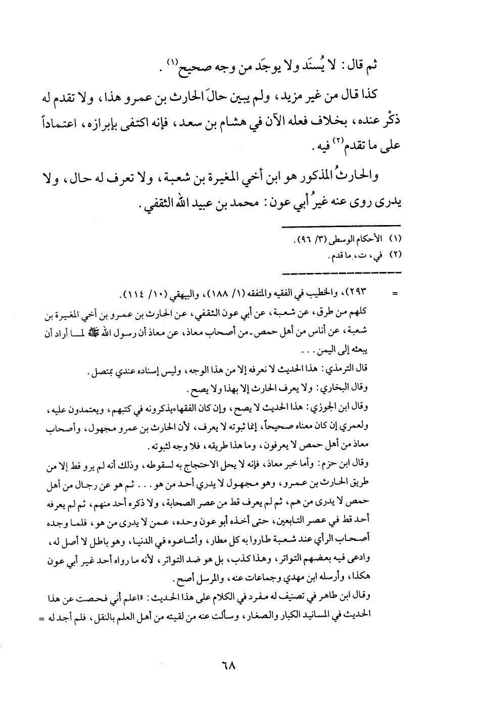 والْحَارث الْمَذْكُور هُوَ ابْن أخي الْمُغيرَة بن شُعْبَة، وَلَا تعرف لَهُ حَال، وَلَا يدرى روى عَنهُ غير أبي عون: مُحَمَّد بن عبيد الله الثَّقَفِيّ.