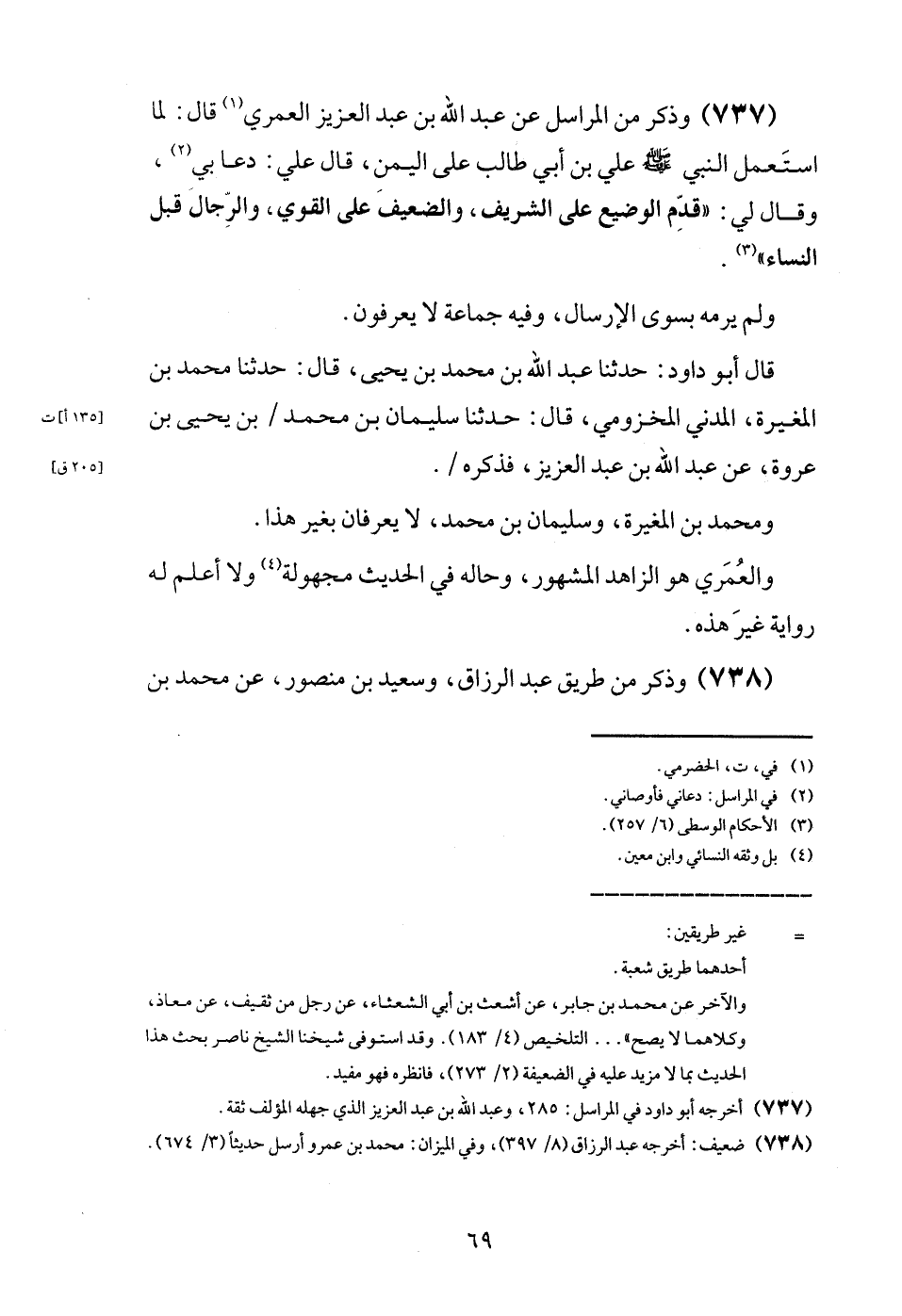 (737) وَذكر من المراسل عَن عبد الله بن عبد الْعَزِيز الْعمريّ قَالَ: لما اسْتعْمل النَّبِي - صَلَّى اللَّهُ عَلَيْهِ وَسَلَّم َ - عَليّ بن أبي طَالب على الْيمن، قَالَ عَليّ: دَعَا بِي، وَقَالَ لي: " قدم الوضيع على الشريف، والضعيف على الْقوي، وَالرِّجَال قبل النِّسَاء ".