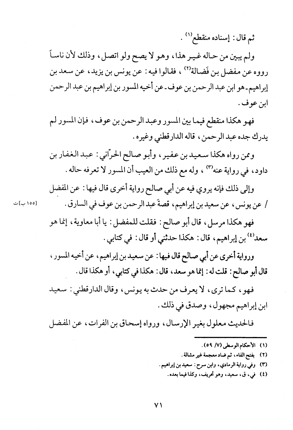وَلم يبين من حَاله غير هَذَا، وَهُوَ لَا يَصح وَلَو اتَّصل، وَذَلِكَ لِأَن نَاسا رَوَوْهُ عَن مفضل بن فضَالة، فَقَالُوا فِيهِ: عَن يُونُس بن يزِيد، عَن سعد بن إِبْرَاهِيم - هُوَ ابْن عبد الرَّحْمَن بن عَوْف - عَن أَخِيه الْمسور بن إِبْرَاهِيم بن عبد الرَّحْمَن ابْن عَوْف.