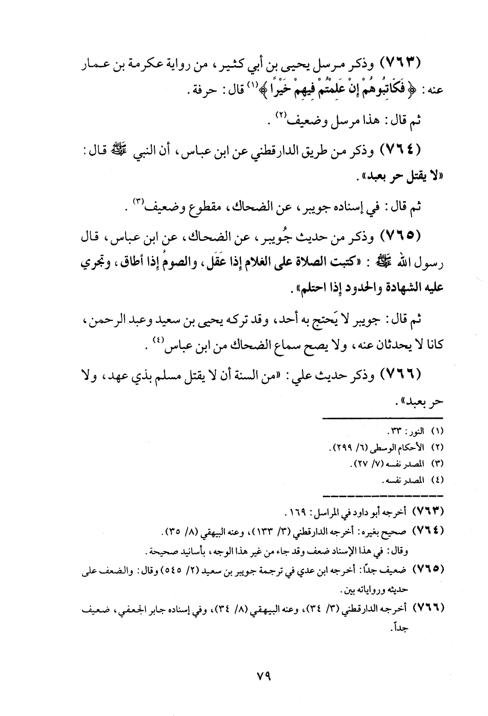 (764) وَذكر من طَرِيق الدَّارَقُطْنِيّ عَن ابْن عَبَّاس، أَن النَّبِي - صَلَّى اللَّهُ عَلَيْهِ وَسَلَّم َ - قَالَ: " لَا يقتل حر بِعَبْد ".