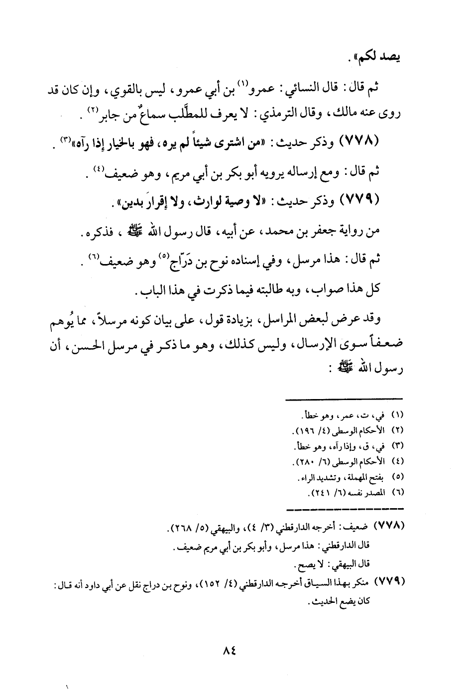 ثمَّ قَالَ: هَذَا مُرْسل، وَفِي إِسْنَاده نوح بن دراج وَهُوَ ضَعِيف. كل هَذَا صَوَاب، وَبِه طالبته فِيمَا ذكرت فِي هَذَا الْبَاب.