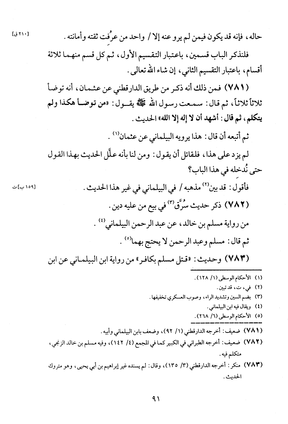 (781) فَمن ذَلِك أَنه ذكر من طَرِيق الدَّارَقُطْنِيّ عَن عُثْمَان، أَنه تَوَضَّأ ثَلَاثًا ثَلَاثًا، ثمَّ قَالَ: سَمِعت رَسُول الله - صَلَّى اللَّهُ عَلَيْهِ وَسَلَّم َ - يَقُول: " من تَوَضَّأ هَكَذَا وَلم يتَكَلَّم، ثمَّ قَالَ: أشهد أَن لَا إِلَه إِلَّا الله " الحَدِيث.