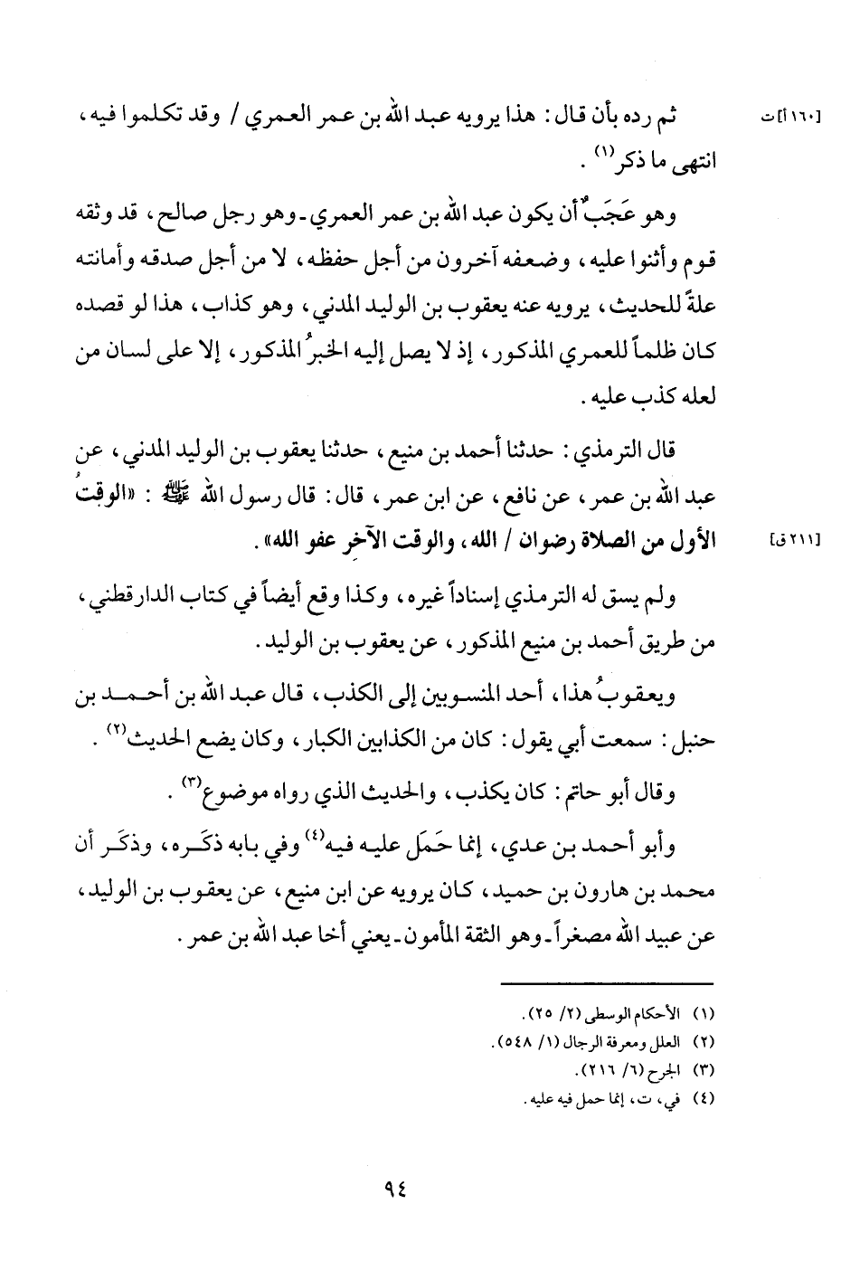 وَهُوَ عجب أَن يكون عبد الله بن عمر الْعمريّ - وَهُوَ رجل صَالح، قد وَثَّقَهُ قوم وأثنوا عَلَيْهِ، وَضَعفه آخَرُونَ من أجل حفظه، لَا من أجل صدقه وأمانته عِلّة للْحَدِيث، يرويهِ عَنهُ يَعْقُوب بن الْوَلِيد الْمدنِي، وَهُوَ كَذَّاب، هَذَا لَو قَصده كَانَ ظلما للعمري الْمَذْكُور، إِذْ لَا يصل إِلَيْهِ الْخَبَر الْمَذْكُور، إِلَّا على لِسَان من لَعَلَّه كذب عَلَيْهِ.