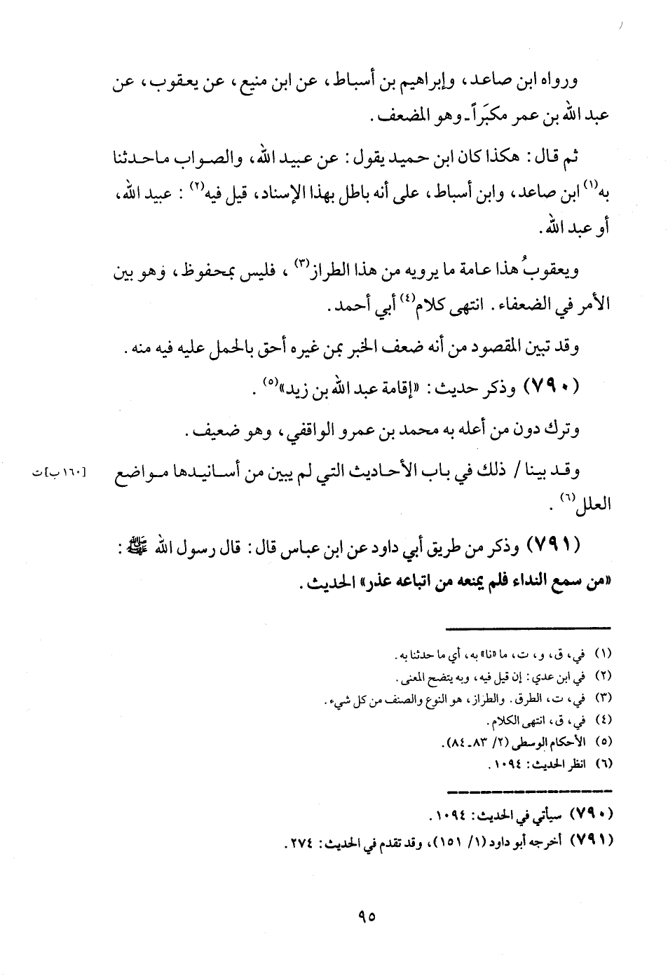 (791) وَذكر من طَرِيق أبي دَاوُد عَن ابْن عَبَّاس قَالَ: قَالَ رَسُول الله - صَلَّى اللَّهُ عَلَيْهِ وَسَلَّم َ -: " من سمع النداء فَلم يمنعهُ من اتِّبَاعه عذر " الحَدِيث.