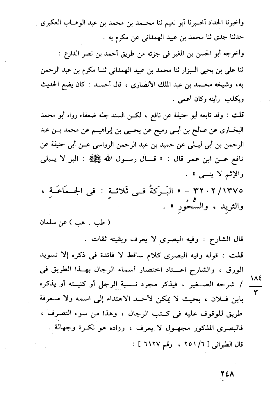 قلت: قوله وفيه البصرى كلام ساقط لا فائدة في ذكره إلا تسويد الورق، والشارح اعتاد اختصار أسماء الرجال بهذا الطريق في شرحه الصغير، فيذكر مجرد نسبة الرجل أو كنيته أو يذكره بابن فلان، بحيث لا يمكن لأحد الاهتداء إلى اسمه ولا معرفة طريق للوقوف عليه في كتب الرجال، وهذا من سوء التصرف، فالبصرى المذكور مجهول لا يعرف، وزاده هو نكرة وجهالة.