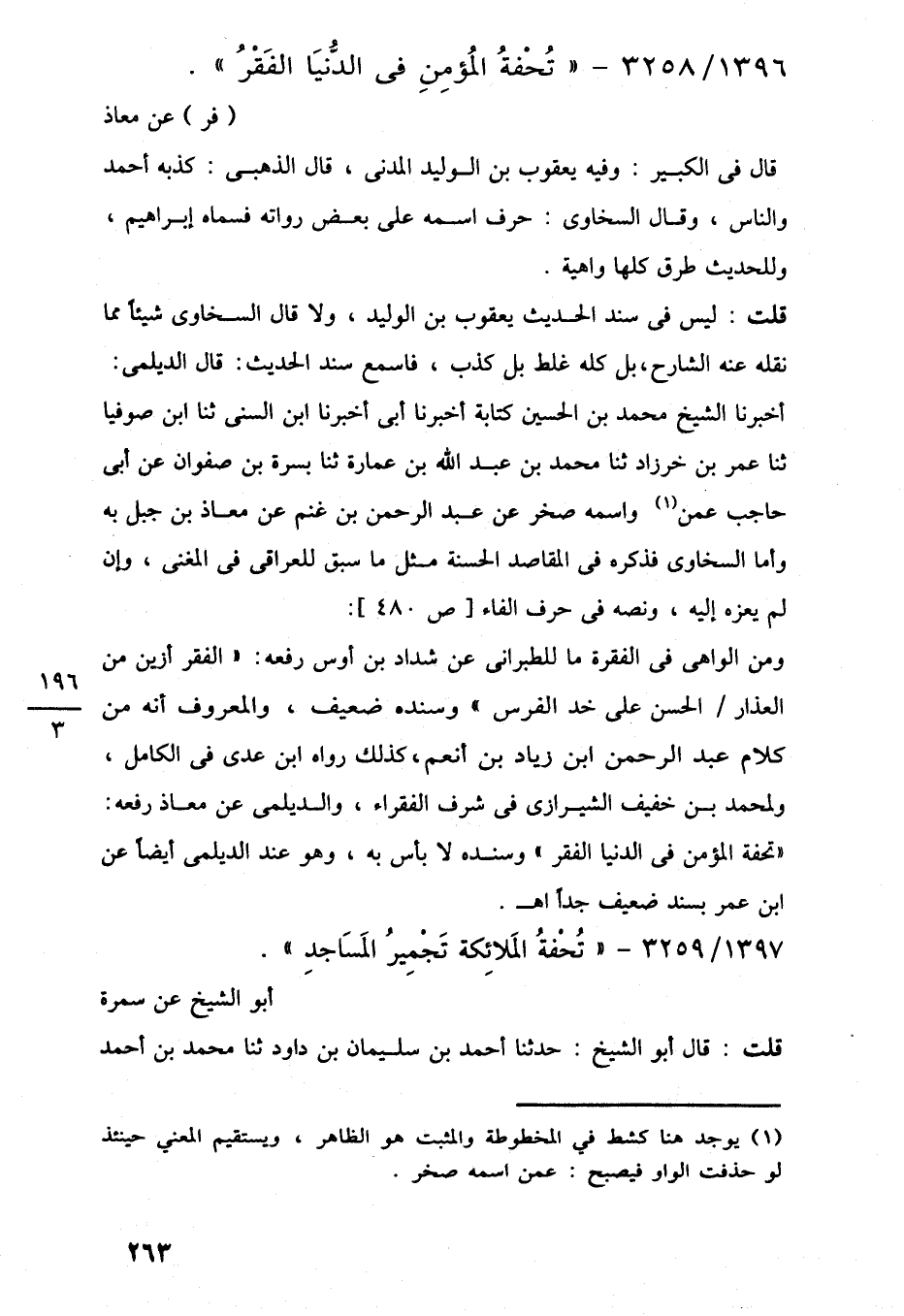 ومن الواهى في الفقرة ما للطبرانى عن شداد بن أوس رفعه: "الفقر أزين من العذار الحسن على خد الفرس" وسنده ضعيف، والمعروف أنه من كلام عبد الرحمن ابن زياد بن أنعم، كذلك رواه ابن عدى في الكامل، ولمحمد بن خفيف الشيرازى في شرف الفقراء، والديلمى عن معاذ رفعه: "تحفة المؤمن في الدنيا الفقر" وسنده لا بأس به، وهو عند الديلمى أيضًا عن ابن عمر بسند ضعيف جدًا اهـ.