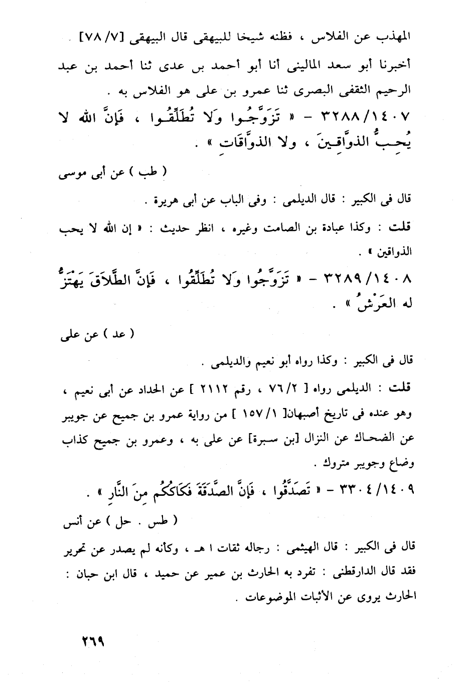 1407/ 3288 - "تَزَوَّجُوا وَلا تُطَلِّقُوا، فَإنَّ اللَّه لا يُحِبُّ الذوَّاقِينَ، ولا الذوَّاقَاتِ".