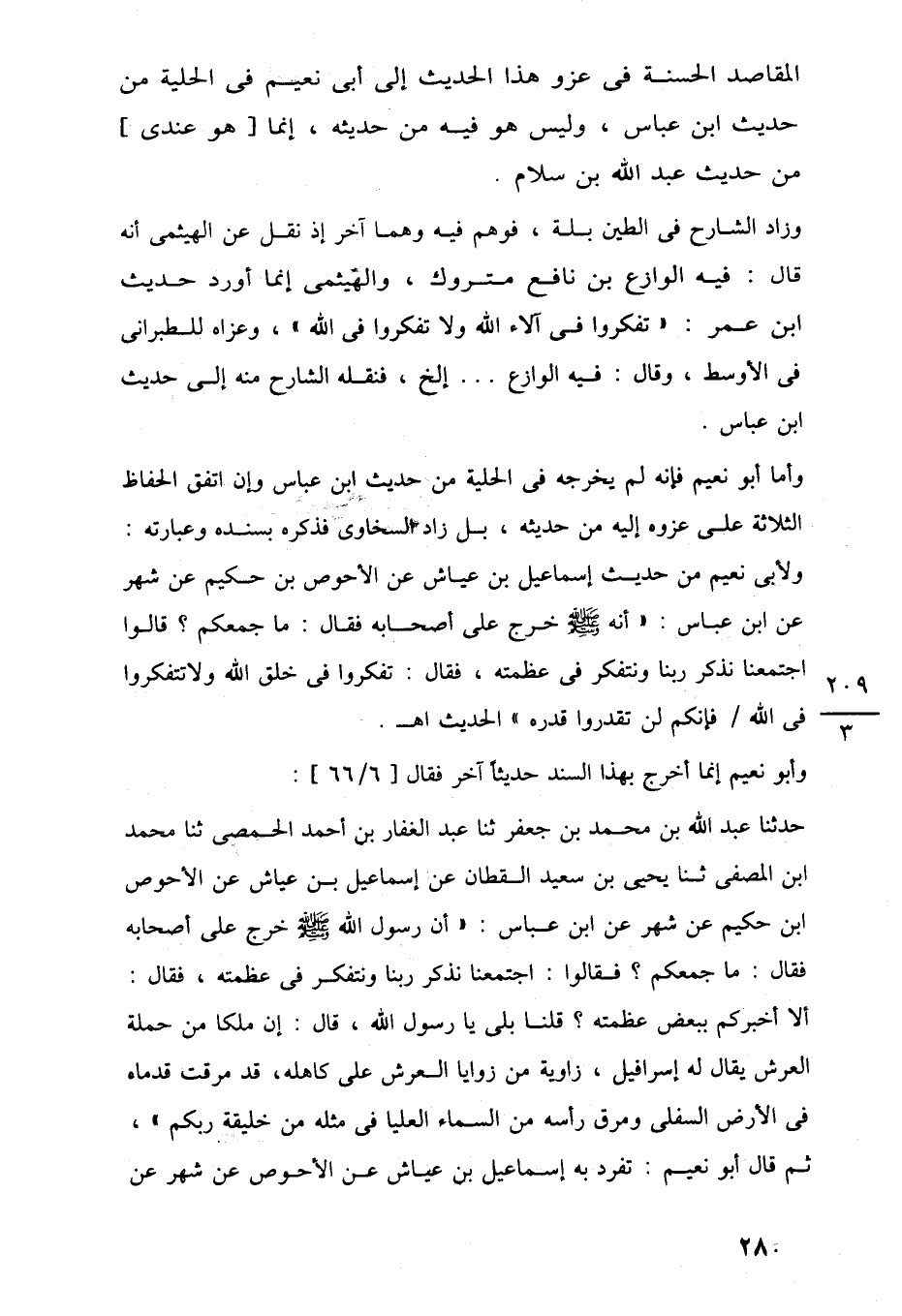 وأما أبو نعيم فإنه لم يخرجه في الحلية من حديث ابن عباس وإن اتفق الحفاظ الثلاثة على عزوه إليه من حديثه، بل زاد السخاوى فذكره بسنده وعبارته: ولأبى نعيم من حديث إسماعيل بن عياش عن الأحوص بن حكيم عن شهر عن ابن عباس: "أنه -صلى اللَّه عليه وسلم- خرج على أصحابه فقال: ما جمعكم؟ قالوا اجتمعنا نذكر ربنا ونتفكر في عظمته، فقال: تفكروا في خلق اللَّه ولا تتفكروا في اللَّه فإنكم لن تقدروا قدره" الحديث اهـ.