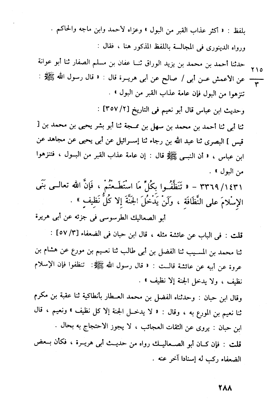 1431/ 3369 - "تَنَظَّفُوا بِكُلِّ مَا اسْتَطَعْتُمْ، فَإِنَّ اللَّه تعالى بَنَى الإِسْلامَ على النَّظَافَةِ، وَلَنْ يَدْخُلَ الجَنَّةَ إِلا كُلُّ نَظِيفٍ".