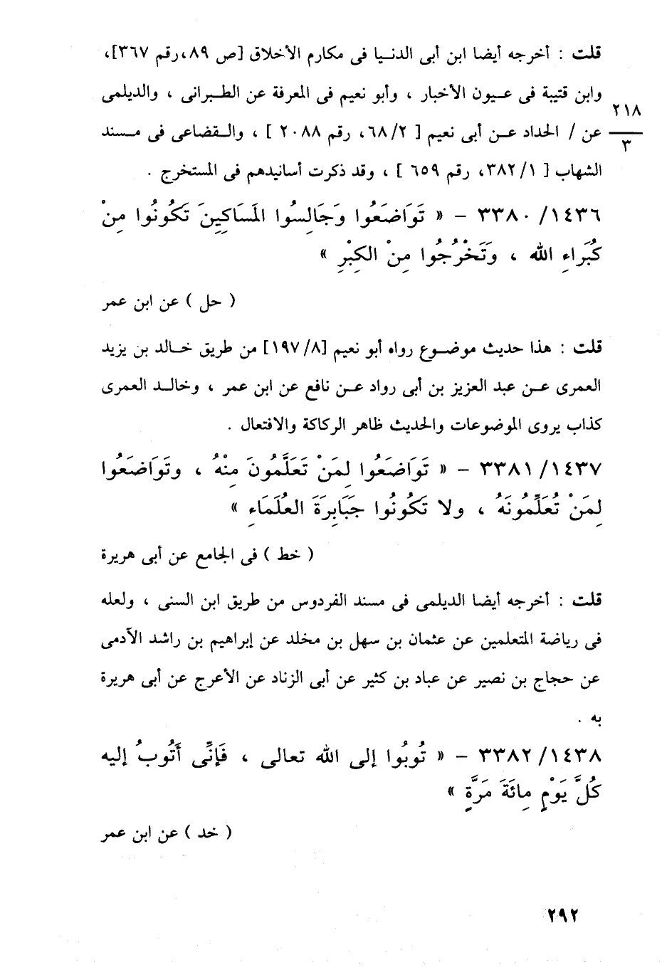 1437/ 3381 - "تَوَاضَعُوا لِمَنْ تَعَلَّمُونَ مِنْهُ، وتَوَاضَعُوا لِمَنْ تُعَلِّمُونَهُ، ولا تَكُونُوا جَبَابِرَةَ العُلَمَاءِ"