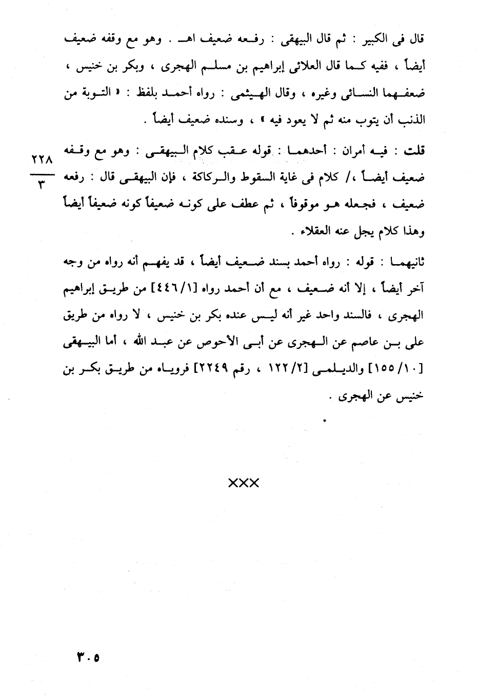 قلت: فيه أمران: أحدهما: قوله عقب كلام البيهقى: وهو مع وقفه ضعيف أيضًا، كلام في غاية السقوط والركاكة، فإن البيهقى قال: رفعه ضعيف، فجعله هو موقوفًا، ثم عطف على كونه ضعيفًا كونه ضعيفًا أيضًا وهذا كلام يجل عنه العقلاء.