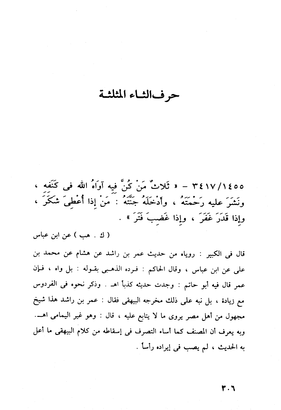 1455/ 3417 - " ثَلاثٌ مَنْ كُنَّ فِيِه آوَاهُ اللَّه في كَنَفِهِ، ونَشَرَ عليه رَحْمَتَهُ، وأدْخَلَهُ جَنَّتهُ: مَنْ إِذا أُعْطِيَ شَكَرَ، وإِذا قَدَرَ غَفَرَ، وإِذا غَضِبَ فَتَرَ".