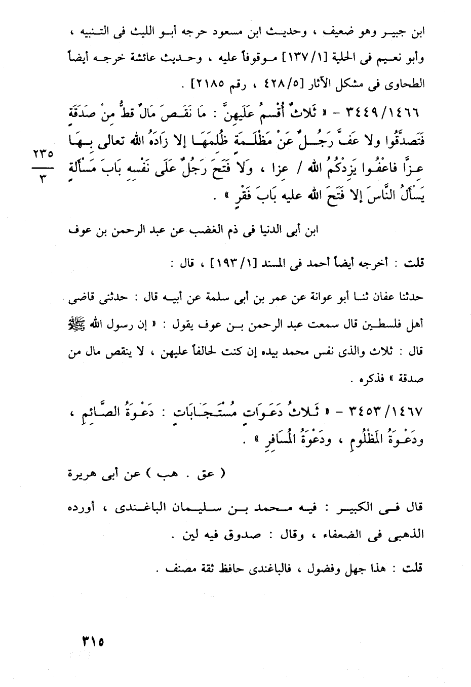 1466/ 3449 - "ثَلاثٌ أُقْسمُ عَلَيهِنَّ: مَا نَقَصَ مَالٌ قطُّ مِنْ صَدَقَةٍ فَتَصدَّقُوا ولا عَفَّ رَجُلٌ عَنْ مَظْلَمَةٍ ظُلِمَهَا إلا زَادَهُ اللَّه تعالى بِهَا عزَّا فاعْفُوا يَزِدْكُمُ اللَّه عِزا، وَلَا فَتَحَ رَجُلٌ عَلَى نَفْسِهِ بَابَ مَسْأَلةٍ يَسأَلُ النَّاسَ إلا فَتَحَ اللَّه عليه بَابَ فَقْرٍ".