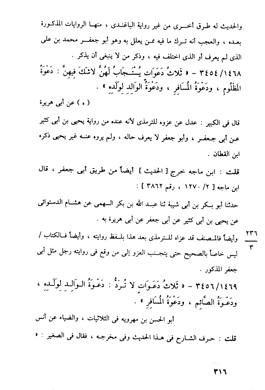 1468/ 3454 - "ثَلاثُ دَعَوَات يُسْتَجَابُ لَهُنَّ لا شَكَ فِيهِنَّ: دَعْوَةُ المَظْلُومِ، ودَعْوَةُ المُسَافِرِ، ودَعْوَةُ الوَالِدِ لِوَلَدِهِ".