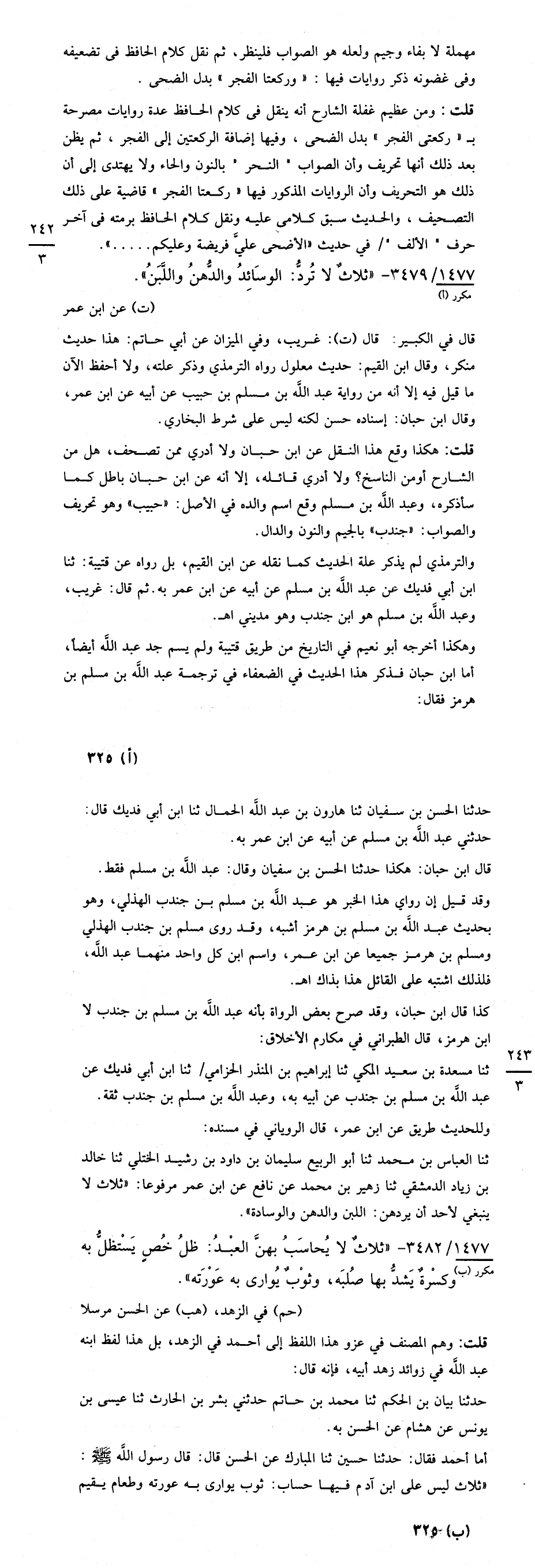 وهكذا أخرجه أبو نعيم في التاريخ من طريق قتيبة ولم يسم جد عبد اللَّه أيضًا، أما ابن حبان فذكر هذا الحديث في الضعفاء في ترجمة عبد اللَّه بن مسلم بن هرمز فقال: