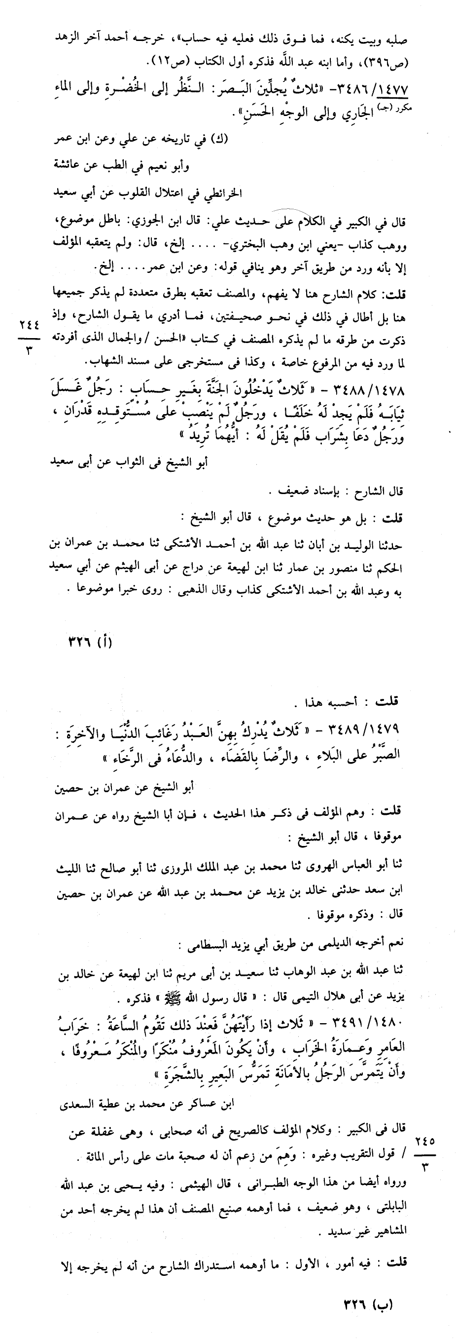 1478/ 3488 - "ثَلَاثٌ يَدْخُلُونَ الجَنَّةَ بِغَيرِ حِسَابٍ: رَجُلٌ غَسَلَ ثِيَابَهُ فَلَمْ يَجدْ لَهُ خَلَفًا، ورَجُلٌ لَمْ يَنْصِبْ علىَ مُسْتَوقِدِهِ قَدْرَانِ، ورَجُلٌ دَعَا بِشَرَاب فَلَمْ يُقَلْ لَهُ: أيُّهُمَا تُرِيدُ"