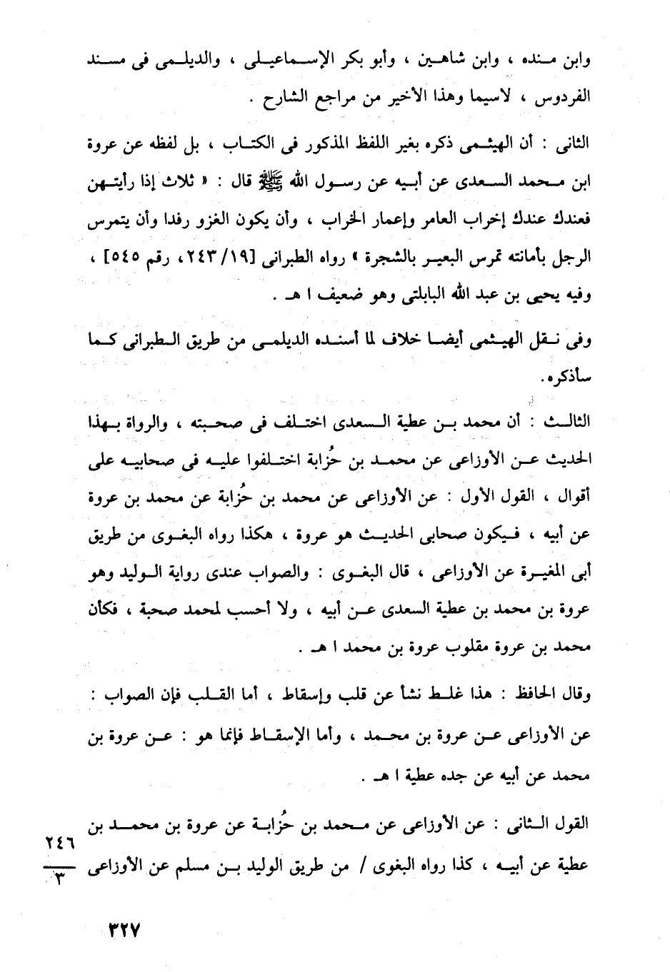 وقال الحافظ: هذا غلط نشأ عن قلب وإسقاط، أما القلب فإن الصواب: عن الأوزاعى عن عروة بن محمد، وأما الإسقاط فإنما هو: عن عروة بن محمد عن أبيه عن جده عطية اهـ.