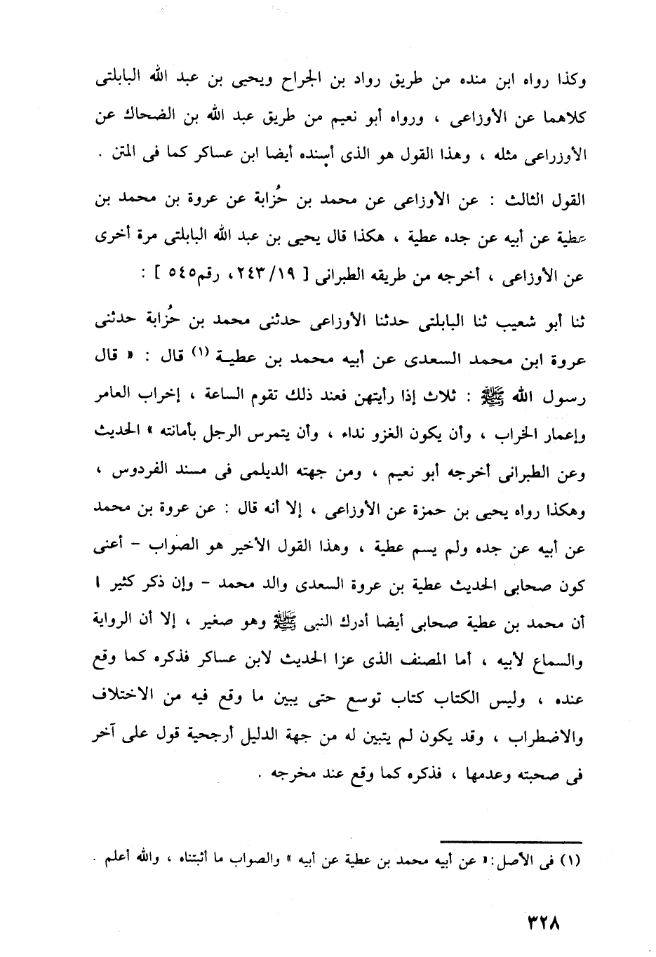 القول الثالث: عن الأوزاعى عن محمد بن حُزابة عن عروة بن محمد بن عطية عن أبيه عن جده عطية، هكذا قال يحيى بن عبد اللَّه البابلتى مرة أخرى عن الأوزاعى، أخرجه من طريقه الطبرانى [19/ 243، رقم 545]: