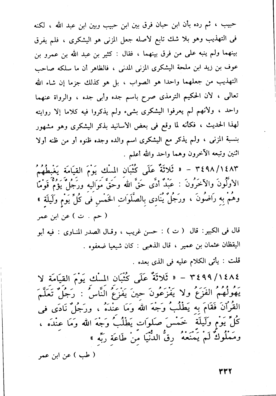 1484/ 3499 - "ثَلاثَةٌ عَلَى كُثبَانِ المِسْكِ يَومَ القِيَامَةِ لا يَهُولُهُمُ الفَزَعُ ولا يَفْزَعُونَ حِينَ يَفْزَعُ النَّاسُ: رَجُلٌ تَعَلَّمَ القُرآنَ فَقَامَ به يَطْلُبُ وجهَ اللَّه وَمَا عنْدَهُ، ورَجُلٌ نَادَى في كُلِّ يَوْمٍ وَلَيلةِ خَمْسَ صَلوَاتٍ يَطلُبُ وَجْهَ اللَّه وَمَا عِنْدَه، ومَمْلُوكٌ لَمْ يَمْنَعْهُ رِقُّ الدُّنيَا مِنْ طَاعَةِ ربِّهِ"